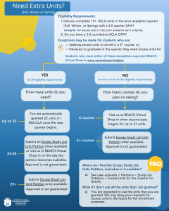 - Summer Excess Units: If you want to enroll in more than 18 units in a summer quarter and meet the eligibility requirements, you may visit the REACH Virtual Hub (CAC/AAP students) in Week 1 of Spring quarter once all your Winter quarter grades are in. The full-time counselor may either approve your request on the spot or ask you to submit your excess unit petition online (see below).